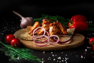 Куриные крылья приготовленные в фирменном маринаде и обжаренный на углях.