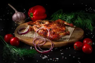 Цыпленок-табака приготовленный в фирменном маринаде и обжаренный на углях.